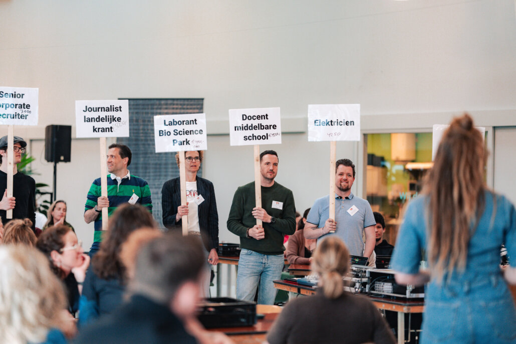 Het publiek – een mix van leden van Werkwaardig en medewerkers van Werkse! – werd ook actief betrokken door de toneelspelers. Zo stelden zij vragen als: wat verdient een advocaat? En wat verdient een vuilnisman? Wat krijgt een wethouder betaald? Met bordjes werd een lijn gemaakt van laag naar hoog. De antwoorden liepen uiteen.